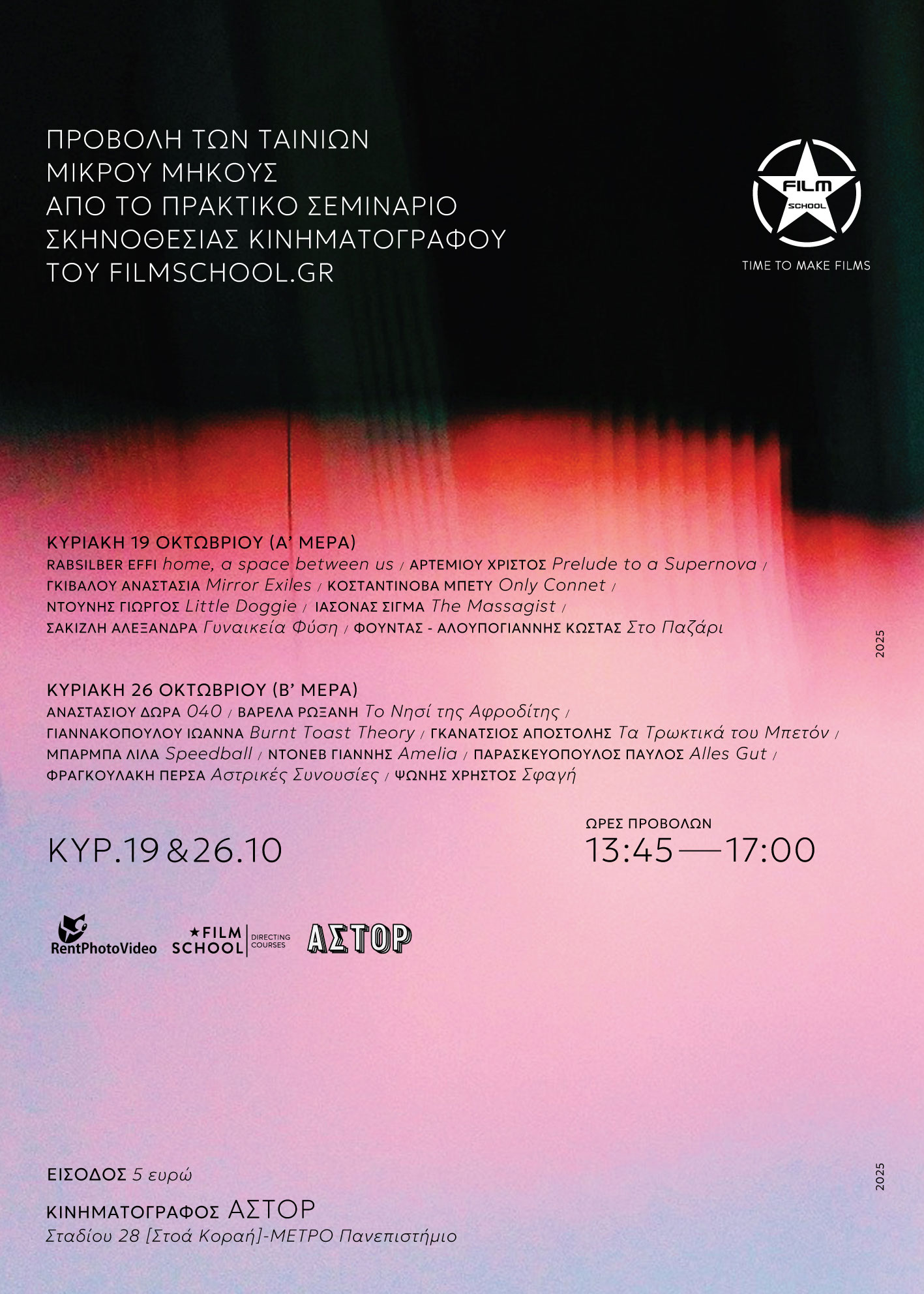 Υποστηρίζοντας την διακεκριμένη δουλειά των σπουδαστών του, το Filmschool προβάλλει τις Κυριακές 19 και 26 Οκτωβρίου 2025 μία επιλογή από ταινίες μικρού μήκους που έχουν παραχθεί στην διάρκεια προηγούμενων workshops στο ΑΣΤΟΡ (πλατεία Κοραή, ΜΕΤΡΟ Πανεπιστήμιο) με ελεύθερη είσοδο.