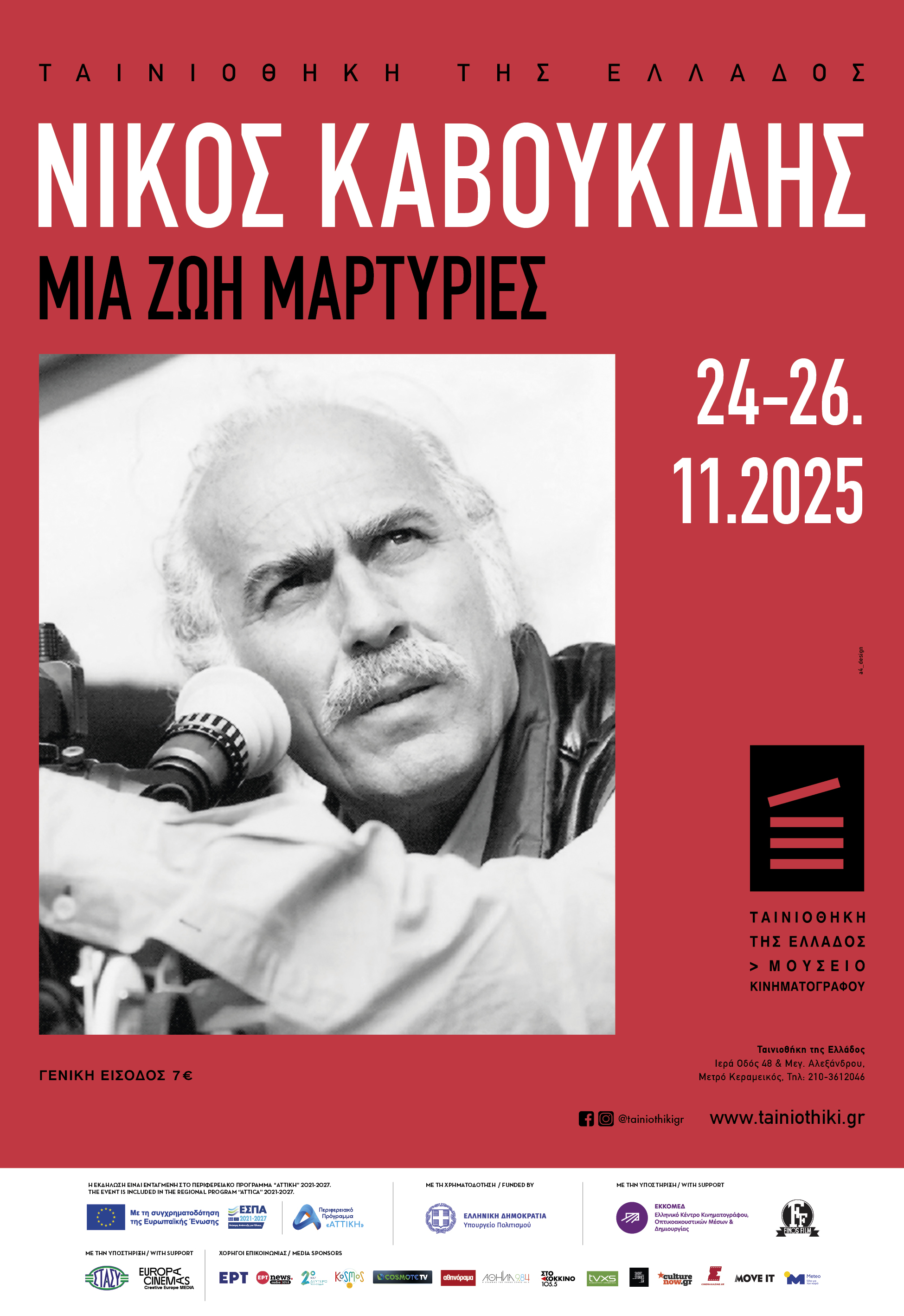 Η τελετή έναρξης του αφιερώματος στον Νίκο Καβουκίδη θα πραγματοποιηθεί τη Δευτέρα 24 Νοεμβρίου 2025, στις 20:00, στην Ταινιοθήκη της Ελλάδος. Στις 20:30 θα προβληθεί η ταινία Μαρτυρίες (1975, 102') παρουσία του σκηνοθέτη.