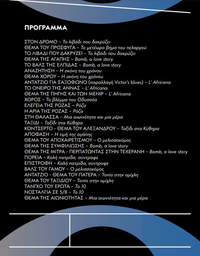 Η συνθέτις θα παρουσιάσει τα μουσικά θέματα από όλες τις συνεργασίες της με τον διεθνούς φήμης Έλληνα δημιουργό Θόδωρο Αγγελόπουλο. Μαζί του άλλωστε έχει γράψει μέρος της παγκόσμιας κινηματογραφικής ιστορίας, σχηματίζοντας ένα από τα κορυφαία δίδυμα της Έβδομης Τέχνης που έχει υμνηθεί όσο λίγα από τους κριτικούς σε ολόκληρο τον κόσμο. Μέσα από τις οκτώ ταινίες της συνεργασίας τους από το 1984 ως το 2008 [(Ταξίδι στα Κύθηρα (1984), Ο μελισσοκόμος (1986), Τοπίο στην ομίχλη (1988), Το μετέωρο βήμα του πελαργού (1991), Το βλέμμα του Οδυσσέα (1995), Μια αιωνιότητα και μια μέρα (1998), Το λιβάδι που δακρύζει (2004), Η σκόνη του χρόνου (2008)] το υποβλητικό έργο των δύο δημιουργών σημάδεψε την τέχνη του κινηματογράφου με την καθολικότητα και την εσωτερική του δύναμη καθιστώντας το αιώνιο.